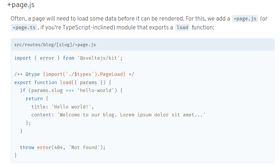 간단하게 위의 코드를 설명하자면 /** @type {import('./$types').PageLoad} */ 부분은 JSDoc이다. 공식문서를 보면 javaDoc과 비슷하다고 하는데 자바는 안해봐서 모르겠지만 JSDoc의 @type 통해서 타입 체킹을 할 수 있다고 한다.
