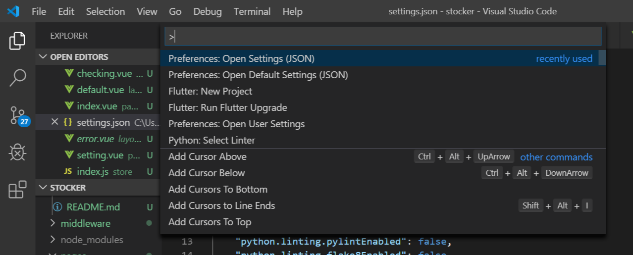 1. 에디터 상단바의 view > commend palette...클릭 (ctr + shift + p)